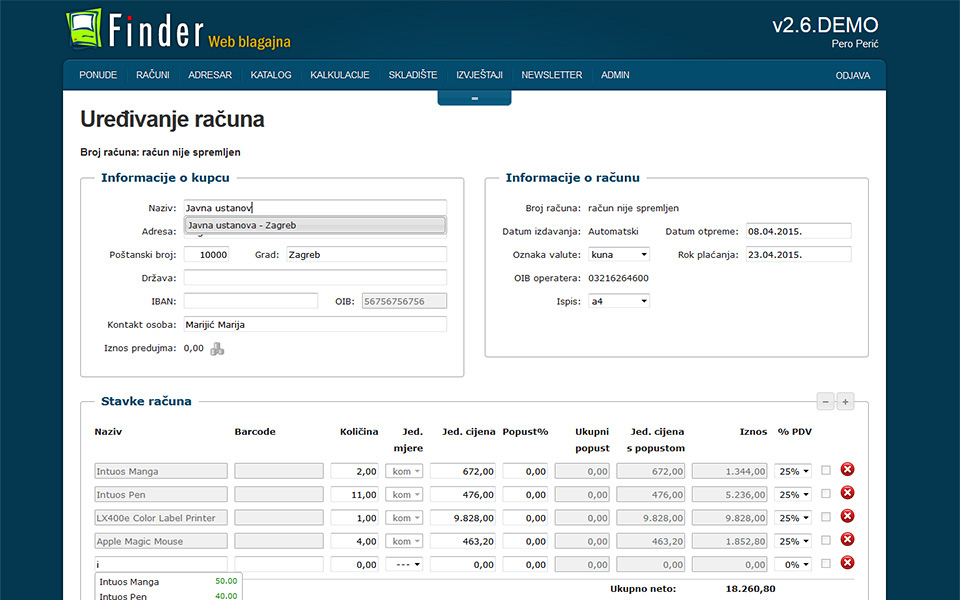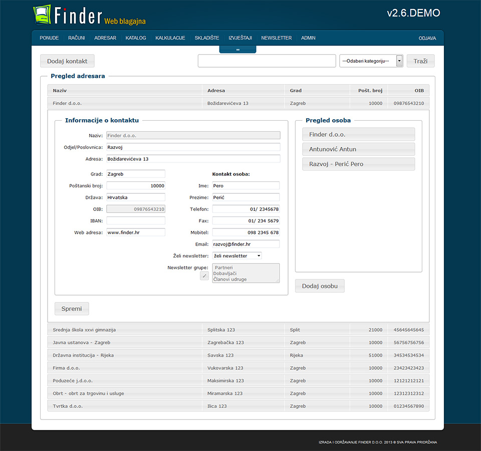 Izradite svoje račune, ponude i kalkulacije brzo i jednostavno koristeći brzi odabir kontakata iz adresara te proizvoda i usluga iz kataloga. Kategorizirajte svoje kontakte unutar adresara i pošaljite željenim grupama kontakata newsletter koristeći integrirani modul za grupno slanje newslettera.