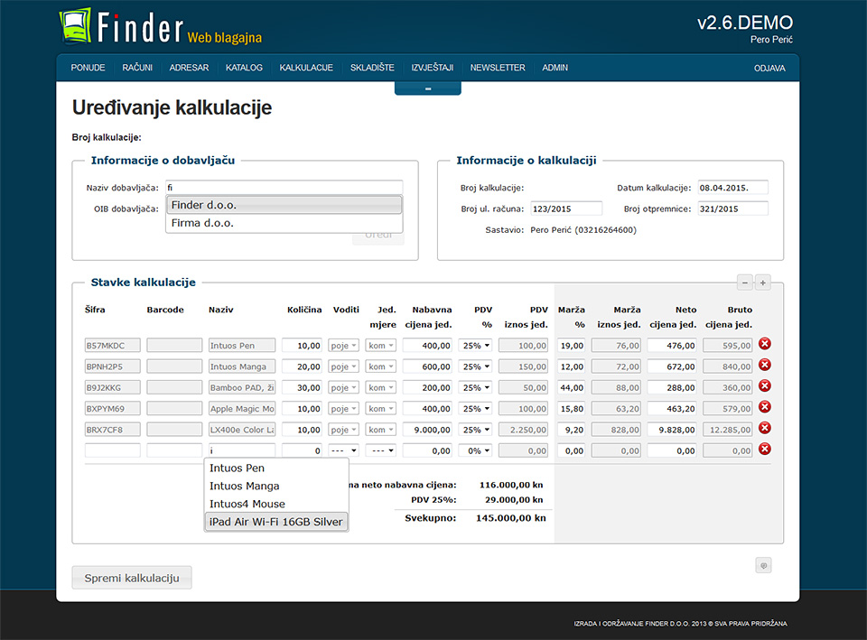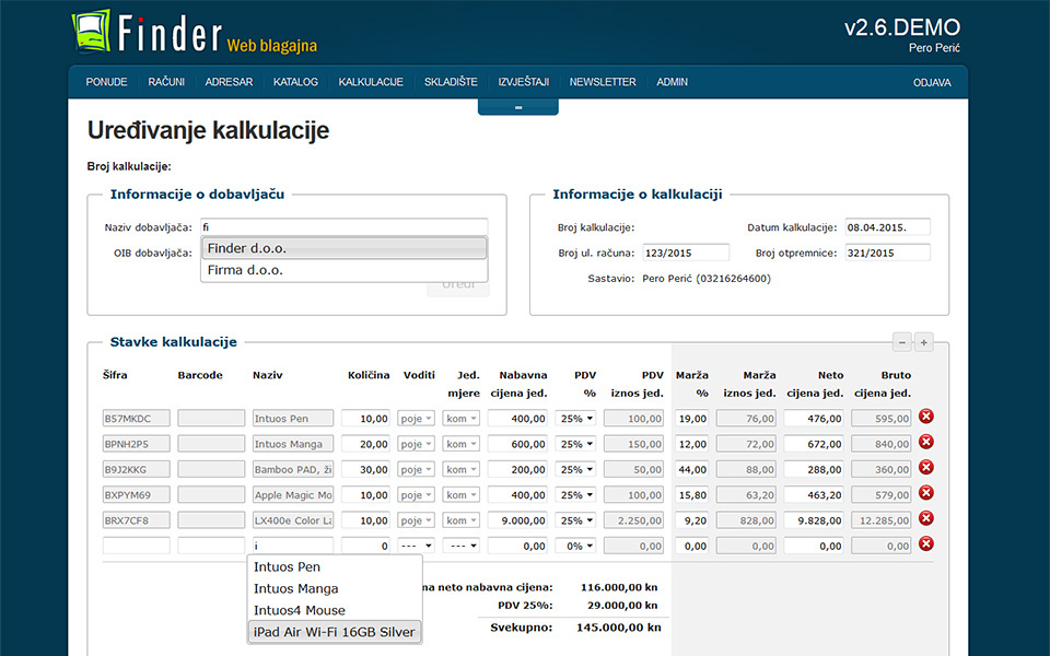 Modul omogućava kreiranje i uređivanje kalkulacija sa svim potrebnim informacijama.