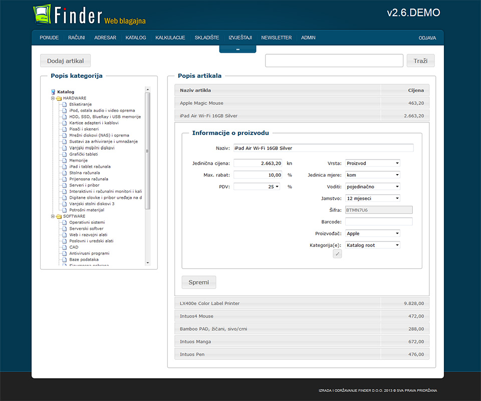 Modul za upis, ažuriranje i kategorizaciju podataka o proizvodima i/ili uslugama. Modul omogućava dodavanje i uređivanje neograničenog broja kategorija proizvoda, kao i neograničenog broja proizvoda unutar svake pojedine kategorije.