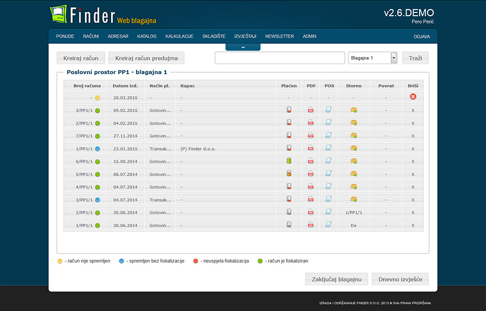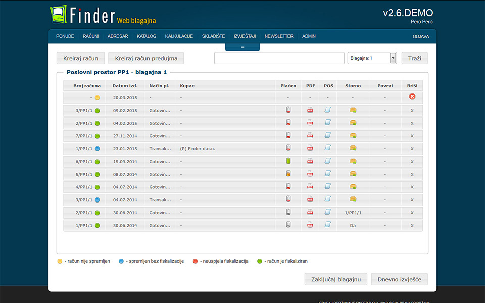 Dostupan je također tablični pregled svih kreiranih računa, uz mogućnost ponavljanja fiskalizacije u slučaju greške tijekom inicijalne prijave računa, iz bilo kojeg razloga, kao i opcija za storniranje računa.