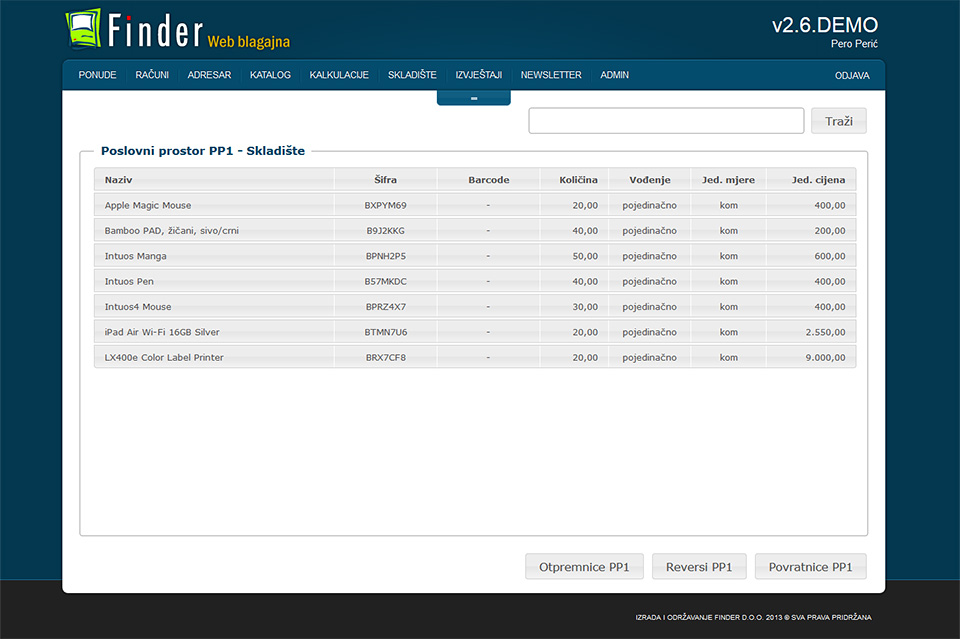 Modul omogućava pregled i uređivanje proizvoda na skladištu te kreiranje, pregled i uređivanje otpremnica, reversa i povratnica.